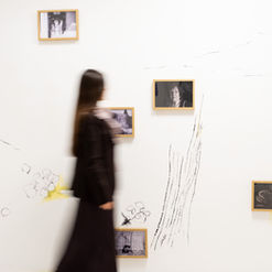 La parte del dibujo constituye la segunda fase de este proceso, en la que la artista, ya distanciada de ese entorno, evoca sus recuerdos del paisaje y lo transforma en un lenguaje propio. Mientras la fotografía captura ese “momento del olvido”, el dibujo implica una acción distinta: surge de la imposibilidad de permanecer en contacto directo con el lugar, pero permite evocarlo a través del gesto. De este modo, se contrasta la apariencia de realidad que ofrece la fotografía con el carácter más difuso del dibujo.